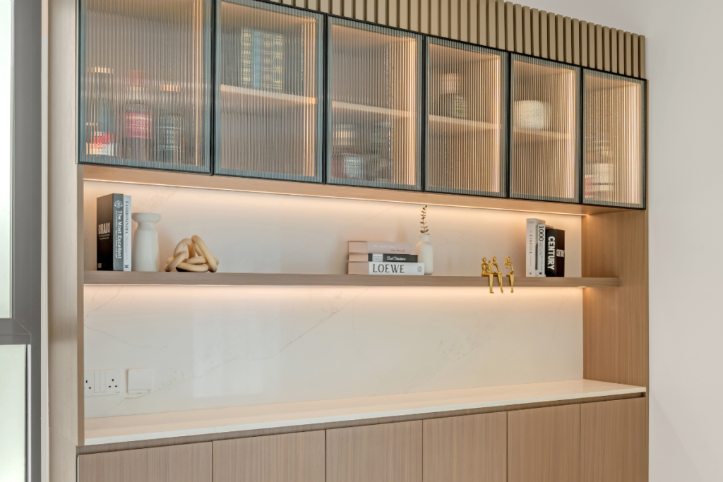Each space within the residence was designed with a clear intention to enhance comfort while maintaining a cohesive design language. The bedrooms were reimagined with custom feature walls that introduced subtle textures and character, creating warm and inviting personal retreats. In the main living area, a contemporary media wall was designed as a statement element, anchoring the space while maintaining a clean, balanced visual flow. The dining area was complemented by a bespoke BAR unit, adding a layer of sophistication and providing a functional focal point for entertaining.